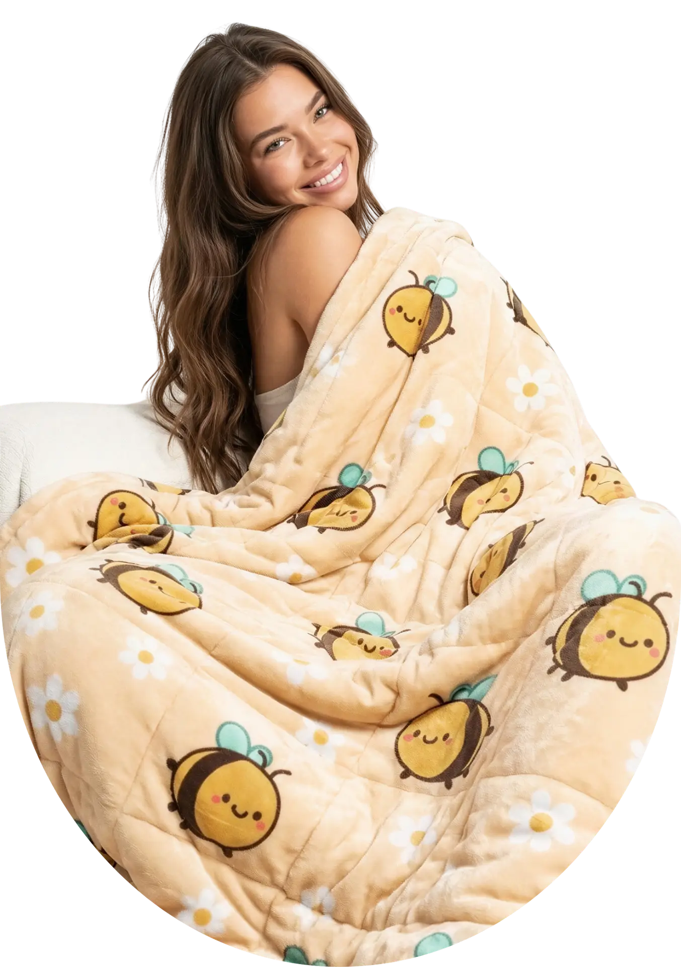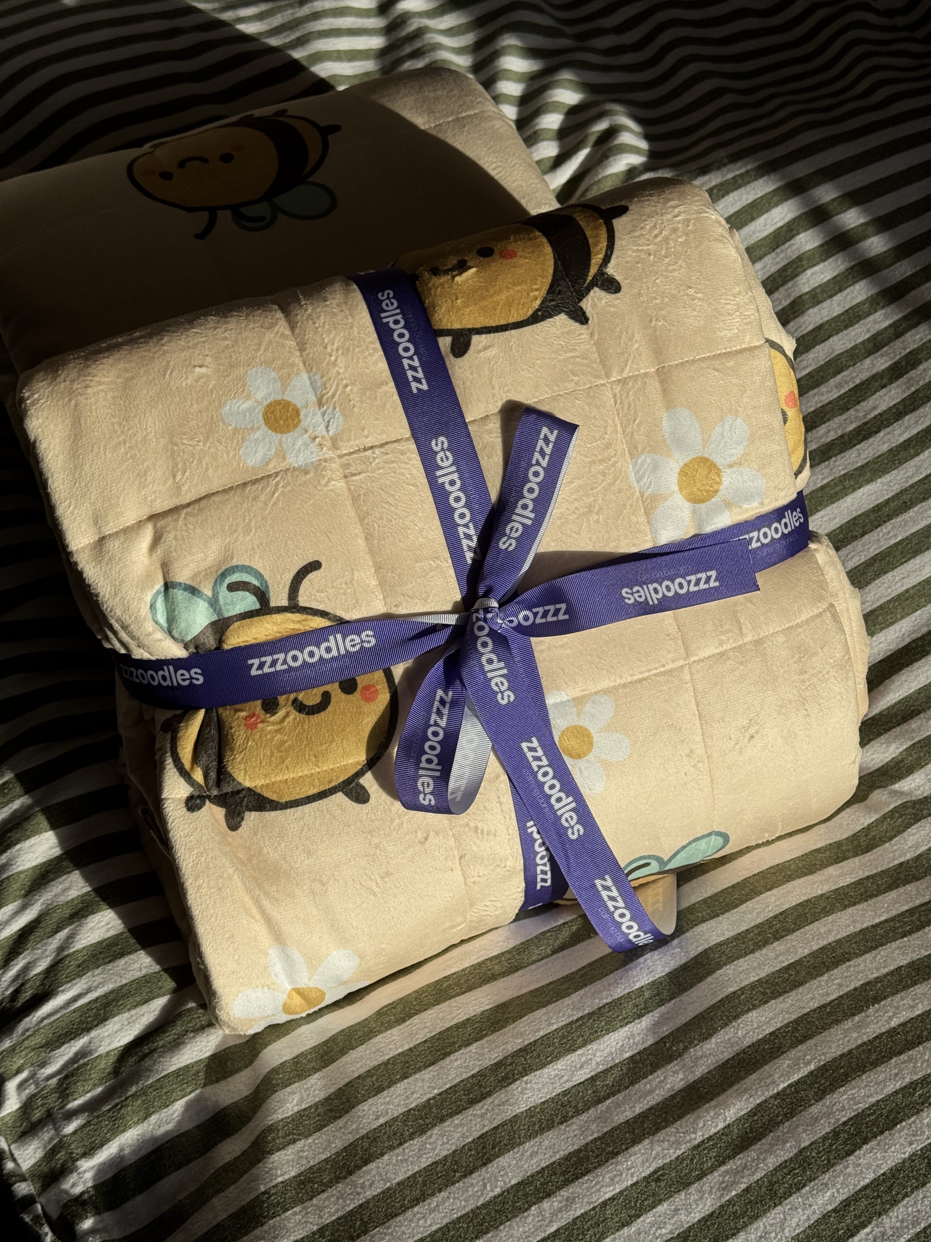Ultra-soft plush Bee print weighted blanket – it uses the science of Deep Pressure Stimulation to help relieve anxiety and promotes deeper, more restful sleep.